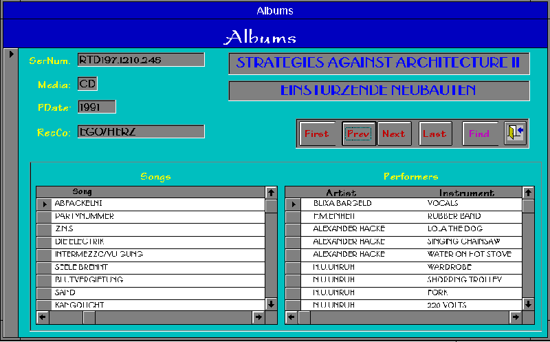 In the form pictured, a range of Access controls have been used to display data from 3 underlying tables. The form contains 2 sub-forms, each of which displays the formatted result tables of equijoins with the main form table. Command buttons have been placed to provide a navigation pad for the user, and form properties have been engineered to prevent the user from performing certain actions. Values from tables have been formatted, with fonts, colours and sizes all specified to create a certain look.