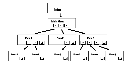 Hierarchical menu systems can be constructed in Access by providing a master form with command buttons that open other forms that open other forms (usually using Macros - see Section 3.7). Each form should have navigation control buttons to launch lower level forms along with a close button to return to the previous level. As a general rule, form style should be planned out to provide the user with a consistent look or feel.