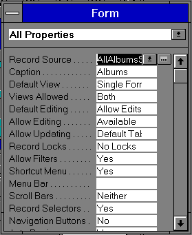 Event driven properties and data properties of form elements like sub- forms, control buttons and the like can be directly specified using by first selecting the relevant object, and then opening a properties sheet for that object (pressing the properties button on the button bar does this). A huge range of control is on offer in the property sheets, and these properties are grouped logically into Data, Layout, Event and other properties or can be displayed all together.